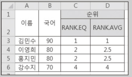 =RANK.AVG(B3, $B$3:$B$6)- 점수가 동일한