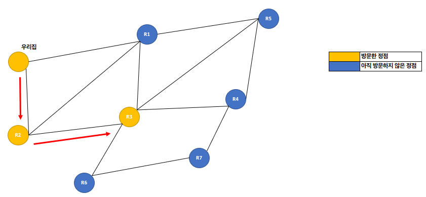 R3정점을 방문함.R2와 연결된 정점은R1과R3이며, 이 중 임의로R3를 먼저 선택하였음.