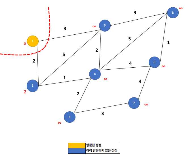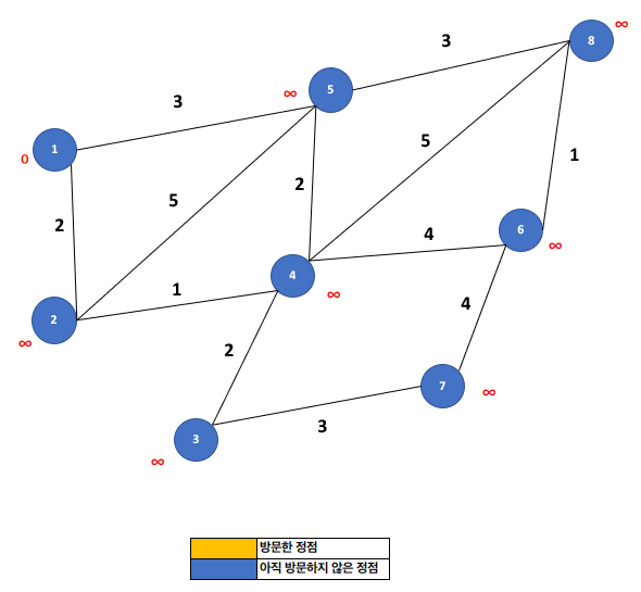 - 모든 정점의 거리 값을 무한대로 초기화함.