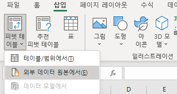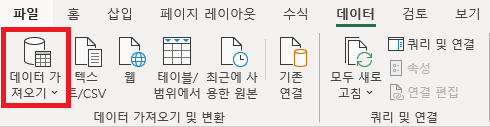 - Excel [데이터] 메뉴 -> [데이터 가져오기 및 변환] 그룹 -> [데이터 가져오기]