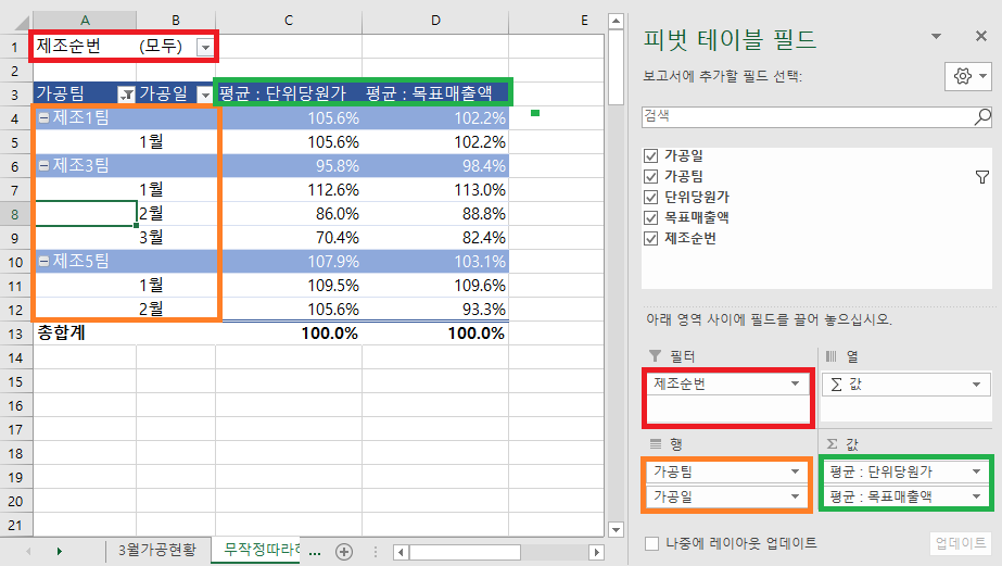 - 행 영역에 지정한 내용은 하나의 열에 모두 표시되고, 열 영역에 지정한 내용은 하나의 행에 모두 표시된다는 점 주의