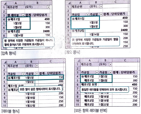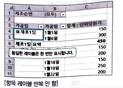 - 행 영역에 여러 개의 필드를 지정하면 하나의 열에 모든 필드를 표시하되, 각 필드의 단계는 들여쓰기로 구분하여 표시함.