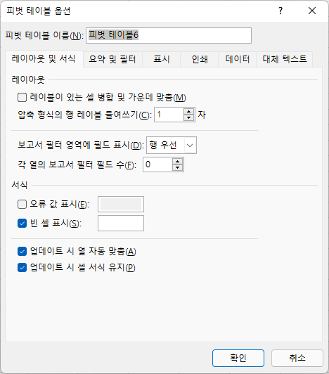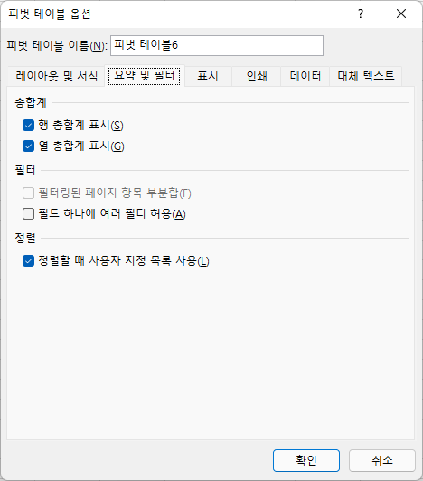 - <피벗 테이블 옵션> 대화상자를 이용하여 피벗 테이블에 대한 다양한 내용을 설정할 수 있음.