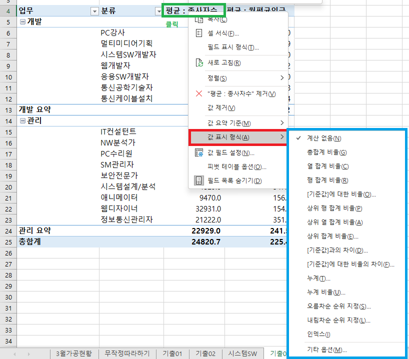 - 값 영역의 바로 가기 메뉴 증 [값 표시 형식]의 하위 메뉴에서 선택함.