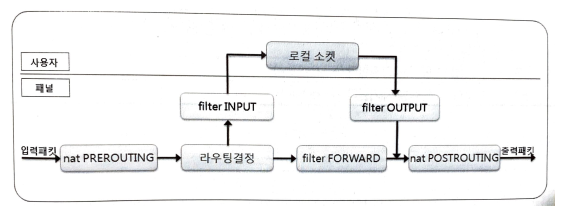- 리눅스 시스템을 통과하는 패킷을 관리하는 사슬