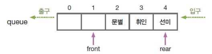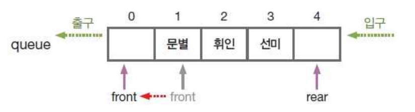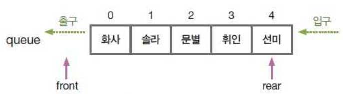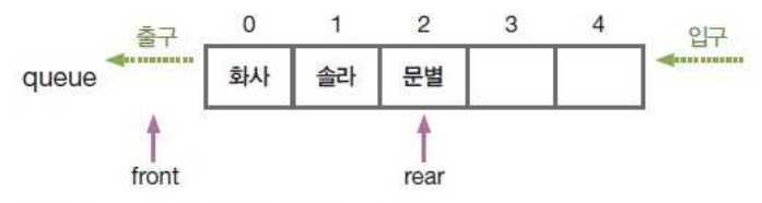 - 큐의 중요한 용어로 front(머리)와 rear(꼬리)가 있다.