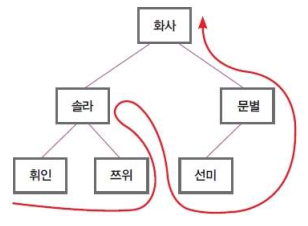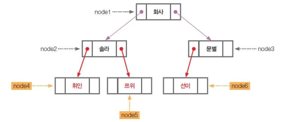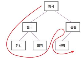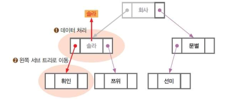 ⑥ 현재 노드(쯔위 노드)는 더 이상 처리할 것이 없으므로 앞 노드(솔라 노드)로 올라간다. 앞 노드도 처리가 완료되었으므로 다시 앞 노드(화사 노드)로 올라가 오른쪽 서브 트리로 이동한다.