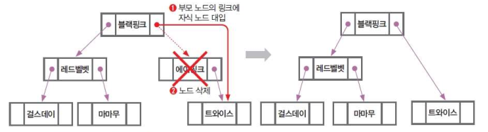자식 노드가 하나인 노드를 삭제할 때는 삭제할 노드를 가리키는 부모 노드의 링크를 자식 노드로 먼저 변경한 후 해당 노드를 삭제해야 한다.