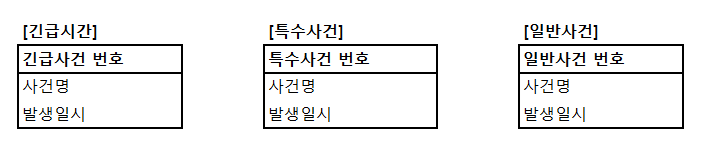 ① UNION ALL 로 조회하면 정렬로 인한 성능이 저하되므로 UNION으로 조합하여 조회한다. ② 긴급사건, 특수사건, 일반사건을 하나의 테이블로 통합하고 PK를 사전분류코드 + 사건번호로 조합하여 구성하도록 한다. ③ 긴급사건, 특수사건, 일반사건 테이블을 개별로 유지하되 PK에 사건분류코드를 포함하도록 한다. ④ 세 개의 테이블을 그대로 유지하되 반정규화된 형태의 통합 테이블을 하나 더 생성하여 조회의 성능을 향상하도록 한다.