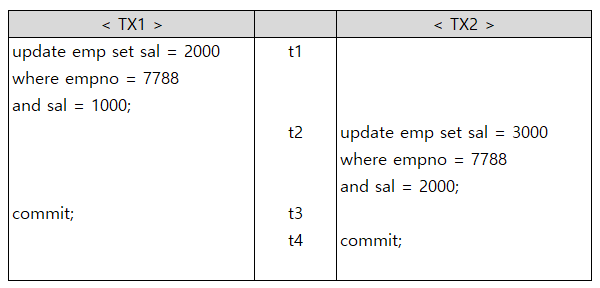 해설 : Oracle은 Update 문장이 시작되는 시작을 기준으로 갱신 대상 레코드를 식별하므로 TX2 트랜잭션의 Update는 실패한다. 따라서 TX1 트랜잭션의 결과가 7788 사원의 최종 결과가 된다. SQL Server에서 TX2 트랜잭션은 TX1 트랜잭션이 완료될 때까지 기다린다. TX1이 끝났을 때 7788 사원의 sal 값은 2000이므로 TX2 트랜잭션이 정상적으로 진행해 값을 3000으로 바꾼다.